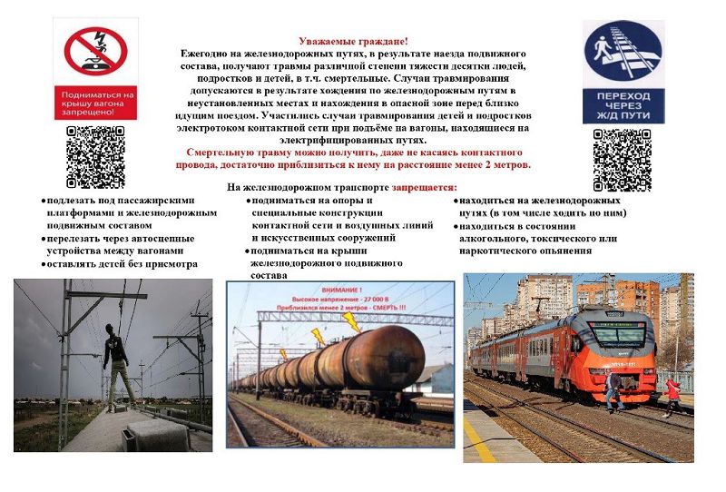 Основными причинами травмирования детей и подростков, а порой и взрослых, являются незнание и нарушение правил безопасности при нахождении в зоне железнодорожных путей, неоправданная спешка и беспечность, нежелание пользоваться переходными мостами, тоннелями и настилами, а порой озорство, хулиганство и игры, как на железнодорожных путях, так и на прилегающей к ним территории.